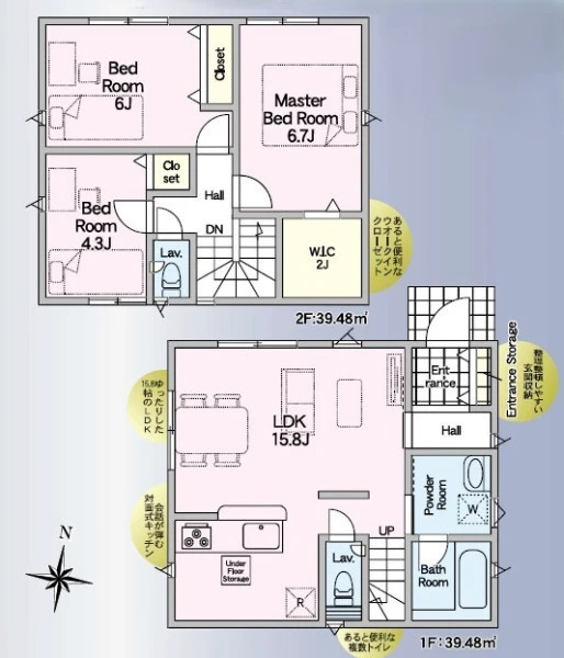 | 設備 | ガスその他、電気、上水道、下水道、システムキッチン、カウンターキッチン、浄水器、IHクッキングヒーター、給湯、トイレ2箇所、温水洗浄便座、シャンプードレッサー、浴室乾燥機、フローリング、複層ガラス、オール電化、収納スペース、ウォークインクローゼット、床下収納、ディンプルキー、モニタ付インターホン、火災警報器等設置済 | ||